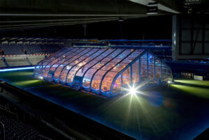 Structura sălii RFS este formată din cadre spațiale modulare. Fiecare modul are un sistem care permite tensiunea în două sensuri a învelișului, ceea ce crește semnificativ parametrii de rezistență ai halei și confortul de utilizare.