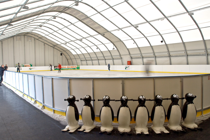 Hala este acoperită cu prelate (una principală și două frontoane) din poliester moale de înaltă calitate, acoperite cu PVC, protejate împotriva razelor UV și mucegaiului. Învelișul este clasificat din punct de vedere al inflamabilității drept neinflamabil, cu parametri confirmați printr-un certificat, impermeabil la apă, îndeplinind cerințele de rezistență pentru materialele utilizate pentru învelișul halelor de corturi.